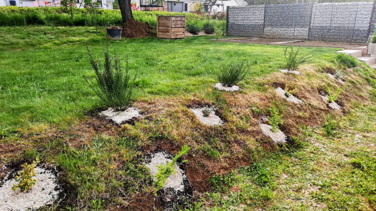 Il muro di contenimento realizzato da Thibaut si integra perfettamente nello spazio e collega in modo molto funzionale le due aree del giardino. La posizione scelta per i gradini consente un comodo accesso al prato e lo spazio ricavato con l’altezza del muro è ideale per inserire delle piante. Thibaut ha optato per delle varietà di arbusti e ha completato il tutto con uno strato protettivo di corteccia. La scelta di queste piante garantisce un po’ di privacy al patio ed è visibile sia dal patio che dal prato.