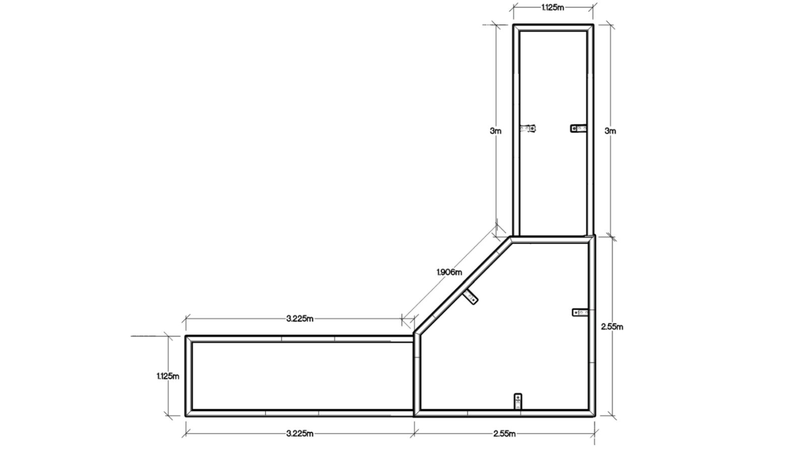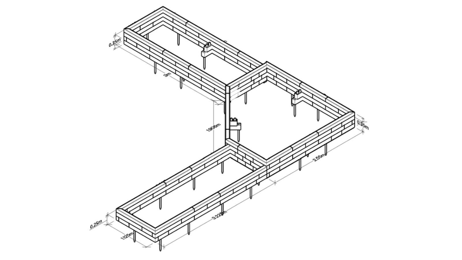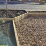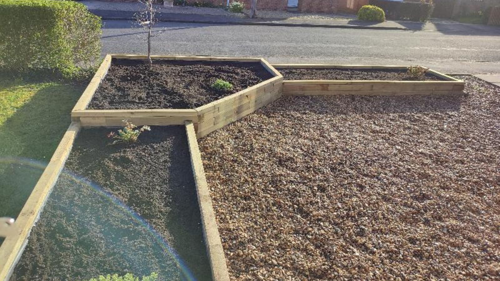 Il progetto finale della fioriera consiste in tre orti rialzati disposti ad angolo/a forma di L. La struttura al centro ha una forma pentagonale su misura ed è più alta dei due orti rialzati rettangolari a entrambi i lati.