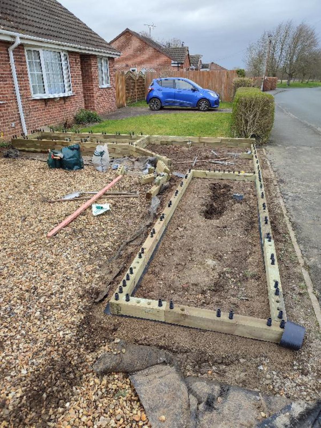 Andrea ha trovato il montaggio di WoodBlocX semplicissimo! La preparazione del terreno è stata la fase più dispendiosa in termini di tempo, poiché doveva assicurarsi che fosse ben livellato. Per preparare il terreno, Andrea ha posato un telo sul suolo per impedire la crescita delle erbacce e ha compattato il terreno prima di aggiungere un rivestimento in plastica sotto il perimetro della struttura WoodBlocX per massimizzarne la durata.