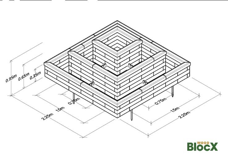 Ideale come elemento centrale del giardino anteriore o posteriore, questa fioriera a piramide, con la sua forma quadrata di 2,25 m x 2,25 m, può essere utilizzata anche per piantare un piccolo albero al centro, circondato da fragole o erbe aromatiche. Le dimensioni interne della fioriera centrale di questo kit sono 0,60 m x 0,60 m x 0,90 m. Ogni livello circostante ha una larghezza di 0,30 m.