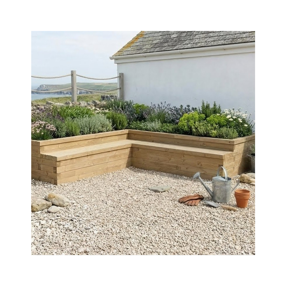 Questa grande fioriera a L con seduta integrata è un design accattivante che offre spazio per splendide piante in un angolo del giardino, creando al contempo un'area relax.