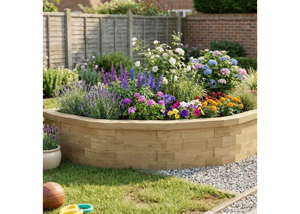 Questa grande aiuola rialzata semicircolare è ideale per dare colore ai giardini rettilinei o da abbinare ad altri per creare un centrotavola da giardino unico e di grande effetto.