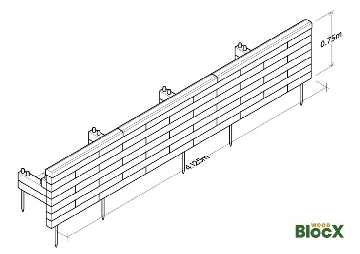 Questo design WoodBlocX imita la struttura e lo stile di un muro di contenimento realizzato utilizzando le tradizionali traversine ferroviarie in legno.