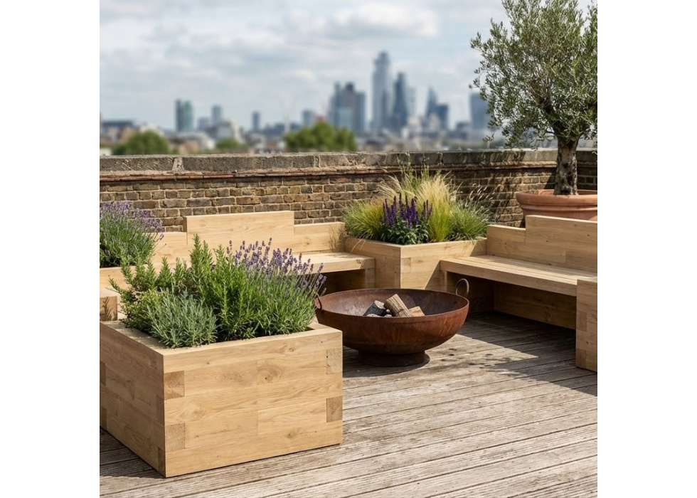 Circondato da 4 fioriere per coltivare fiori, un piccolo albero o un arbusto, o qualsiasi cosa tu voglia piantare! I nostri kit e componenti in legno di pino facili da costruire semplificano l'aggiunta di graziose sedute in legno al tuo giardino o terrazzo: non potrebbe essere più facile, basta seguire le nostre istruzioni di montaggio strato per strato.