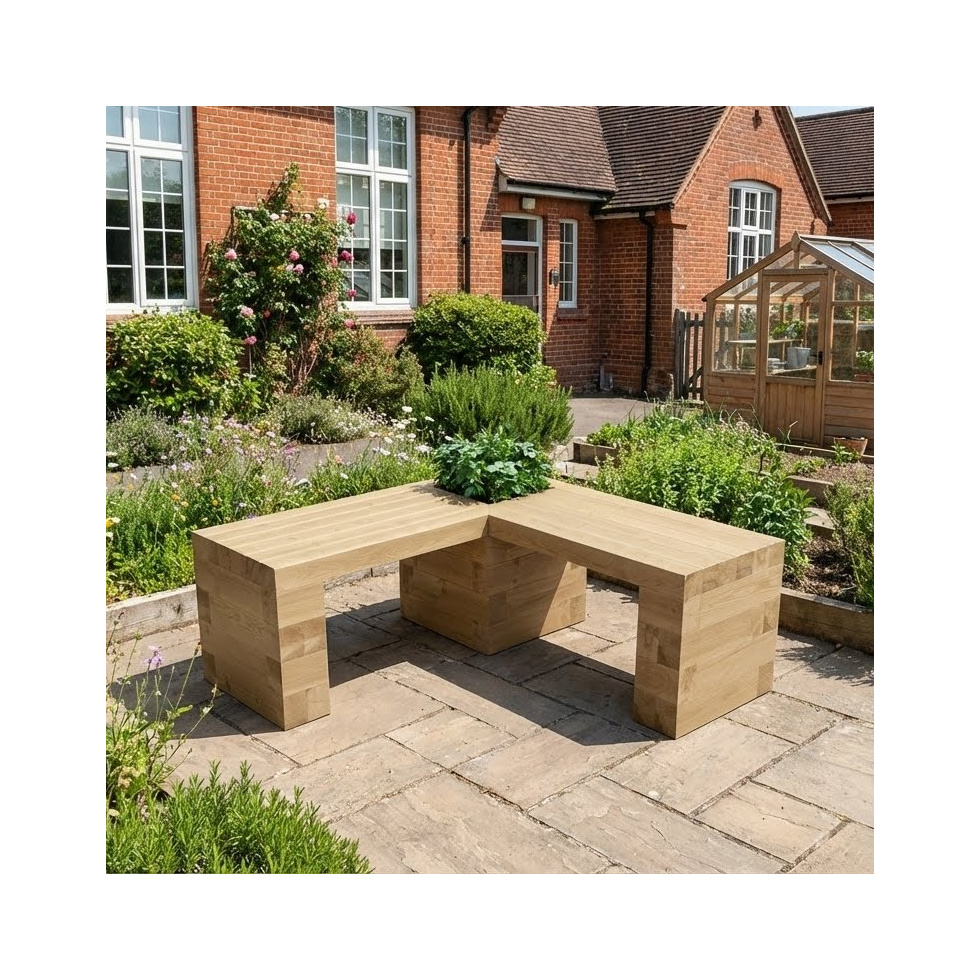 Altezza della seduta della panchina: 0,45 m. Lunghezza della seduta: 0,75 m (a L). C'è una piccola fioriera nell'angolo che ha una dimensione interna di 0,3 m x 0,3 m x 0,45 m di altezza. Realizzata con legno trattato proveniente da fonti sostenibili.